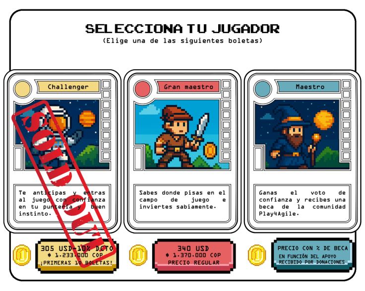 Jugador Maestro: Beca. Con el apoyo de la comunidad Play4Agile, se hace posible que aquellas personas que no pueden pagar la entrada completa, tengan la oportunidad de asistir.